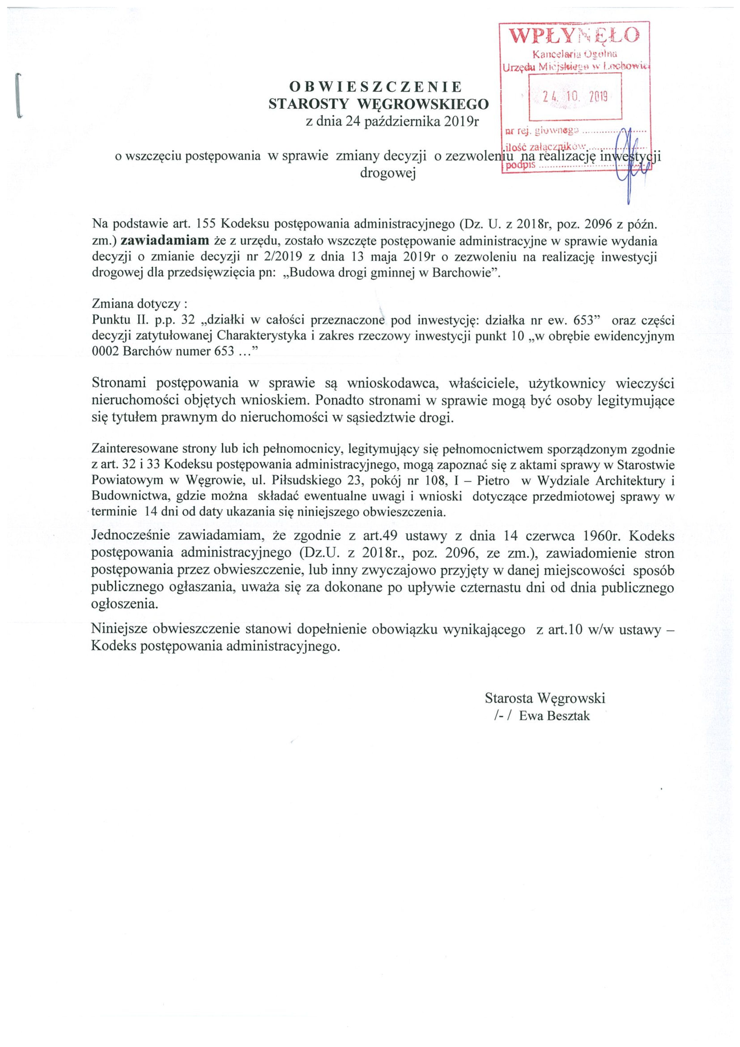 Obwieszczenie Starosty Węgrowskiego z dnia 24 października 2019 roku
